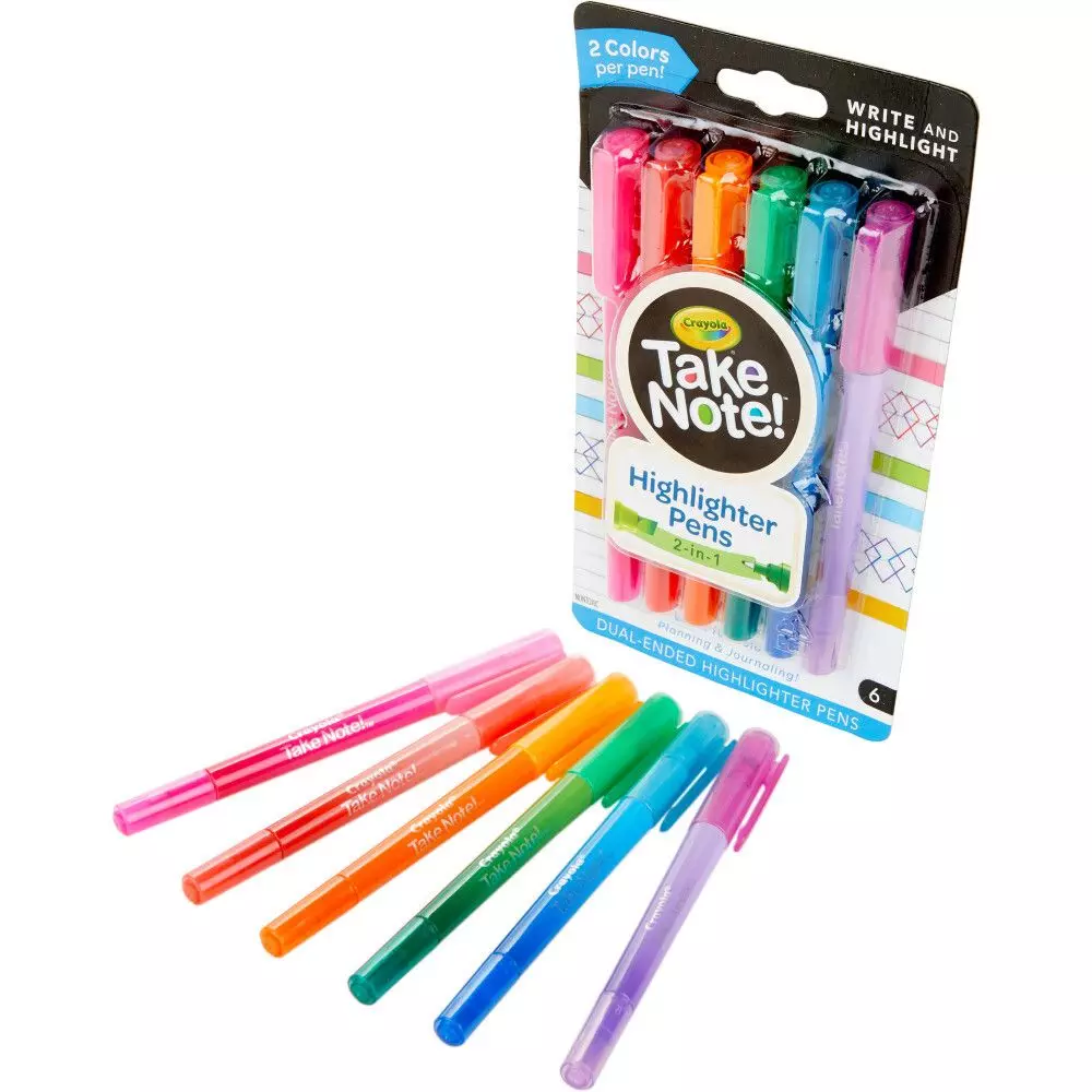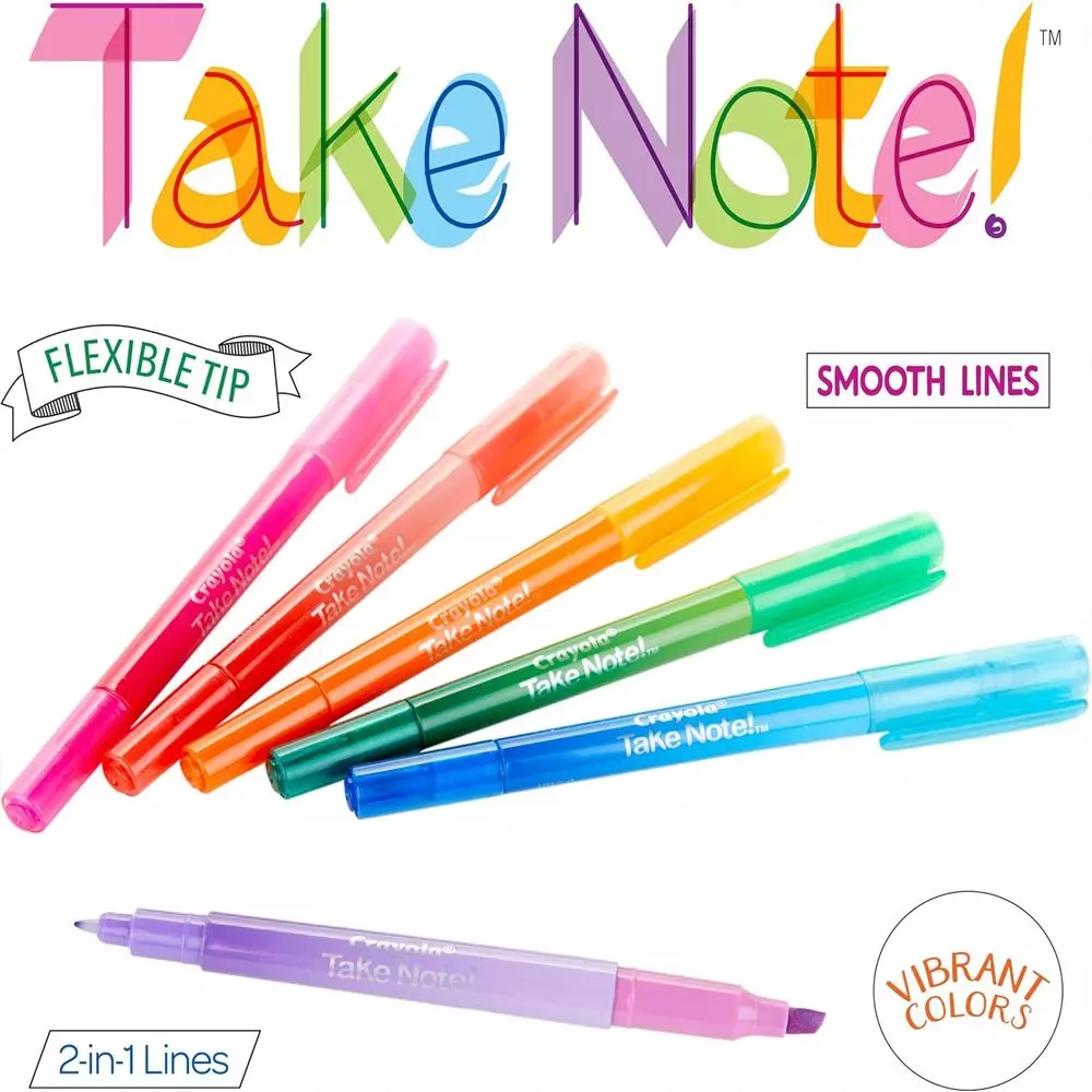 • Capture and accentuate your important notes with Crayola Take Note Dual-Ended Highlighter Pens. These versatile pens feature a fine tip for writing and a chisel tip for broad highlighting, offering both precision and vibrancy.