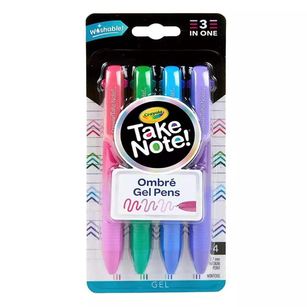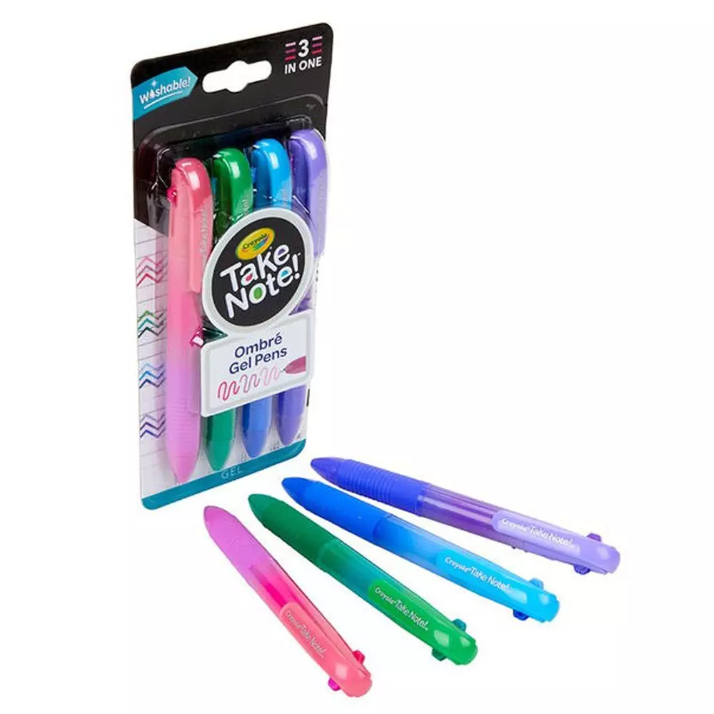 • Add a touch of gradient magic to your art with Crayola Take Note! Ombre Washable Gel Pens. Each pen features three shades for easy gradient and shading effects, making your creations stand out.
