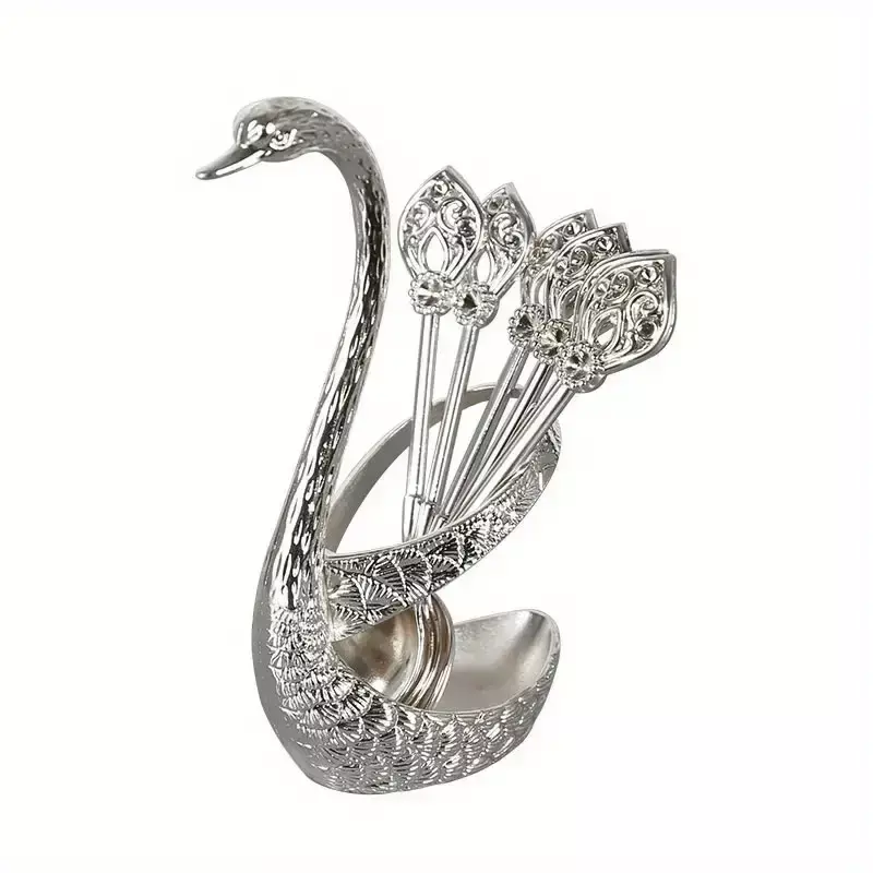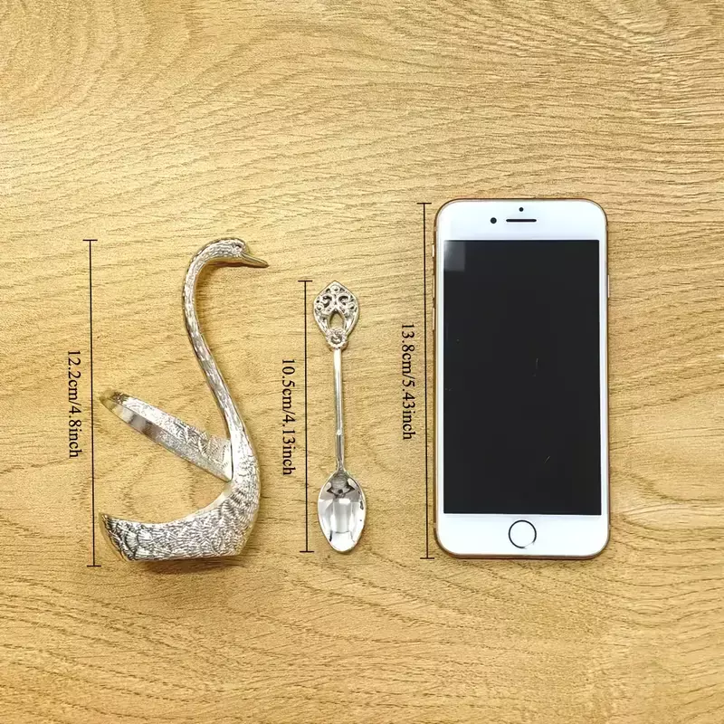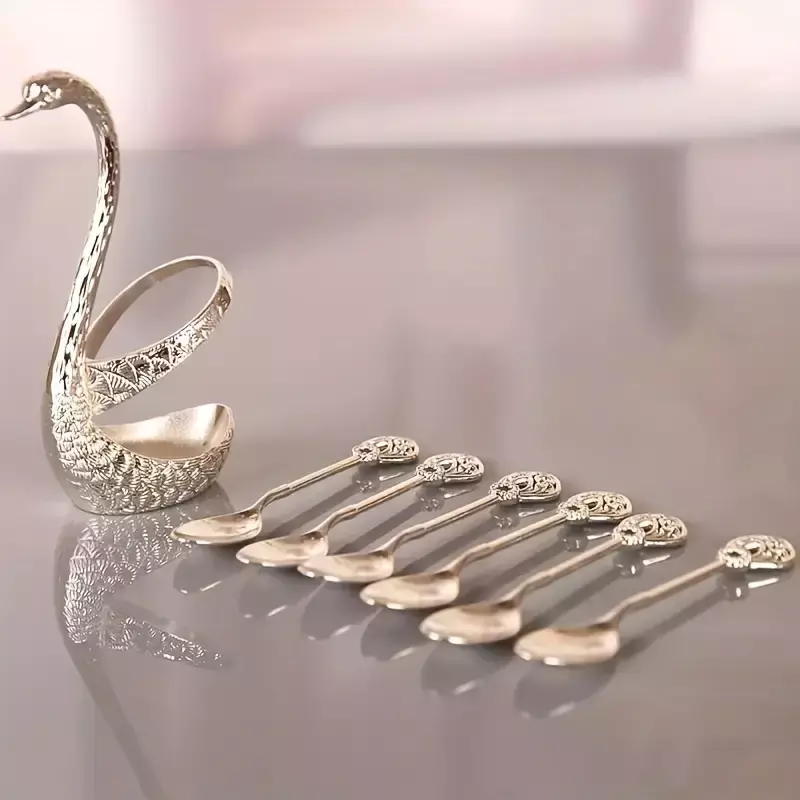 Elegant Swan-Shaped Stainless Steel Coffee Spoon Set with Base 7 Pcs - Silver
