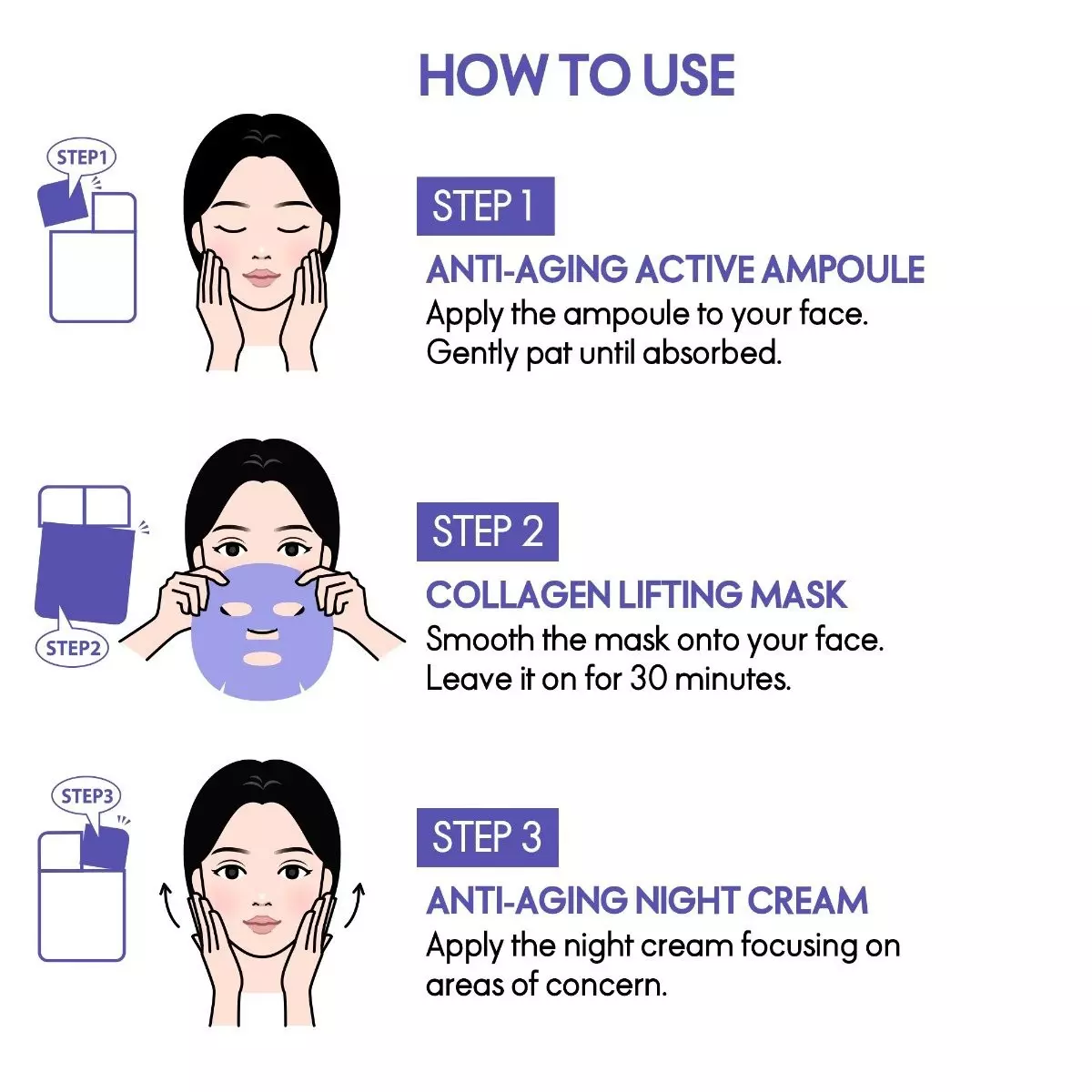 - 3-Step Anti-Aging Care Kit: Includes Active Ampoule, Collagen Lifting Mask, and Night Cream for a complete anti-aging skincare routine.