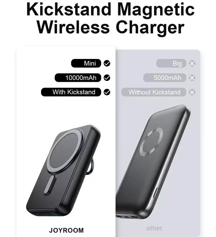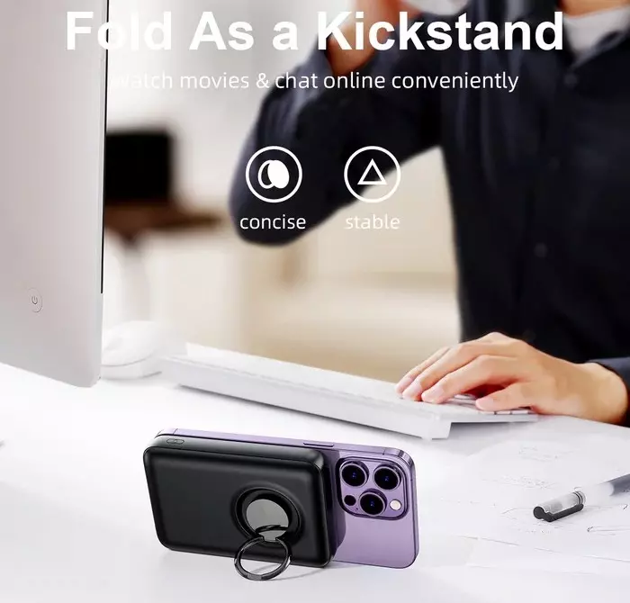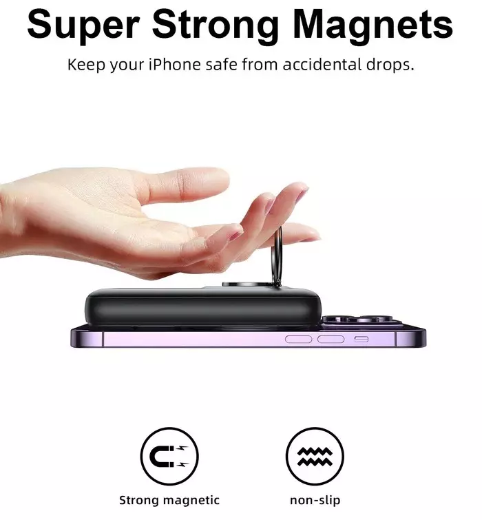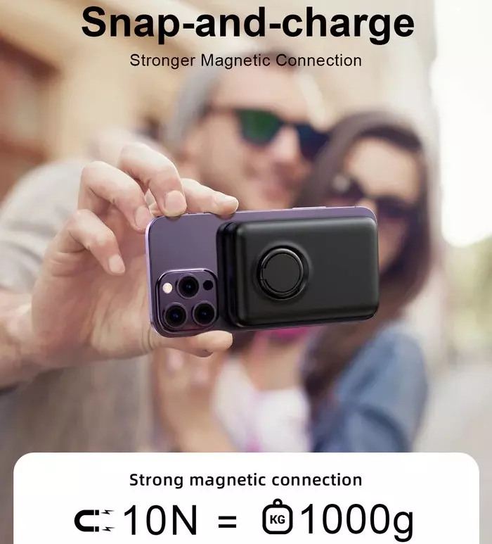 The product is a 20W power bank with a ring holder. It supports wired and wireless charging and can charge three devices simultaneously. It charges mobile phones, tablets, e-book readers, watches, and game consoles. It supports PD3.0, QC3.0, and AFC fast charge protocols. It is compatible with 5W, 7.5W, 10W, 15W magnetic charging. N52H ultra-strong magnets hold the phone securely and ensure continuous charging. The LED indicators let you know the remaining power in real-time. The product has a built-in smart chip and a variety of safety protections such as over-charge, over-discharge, over-voltage and over-temperature protection.