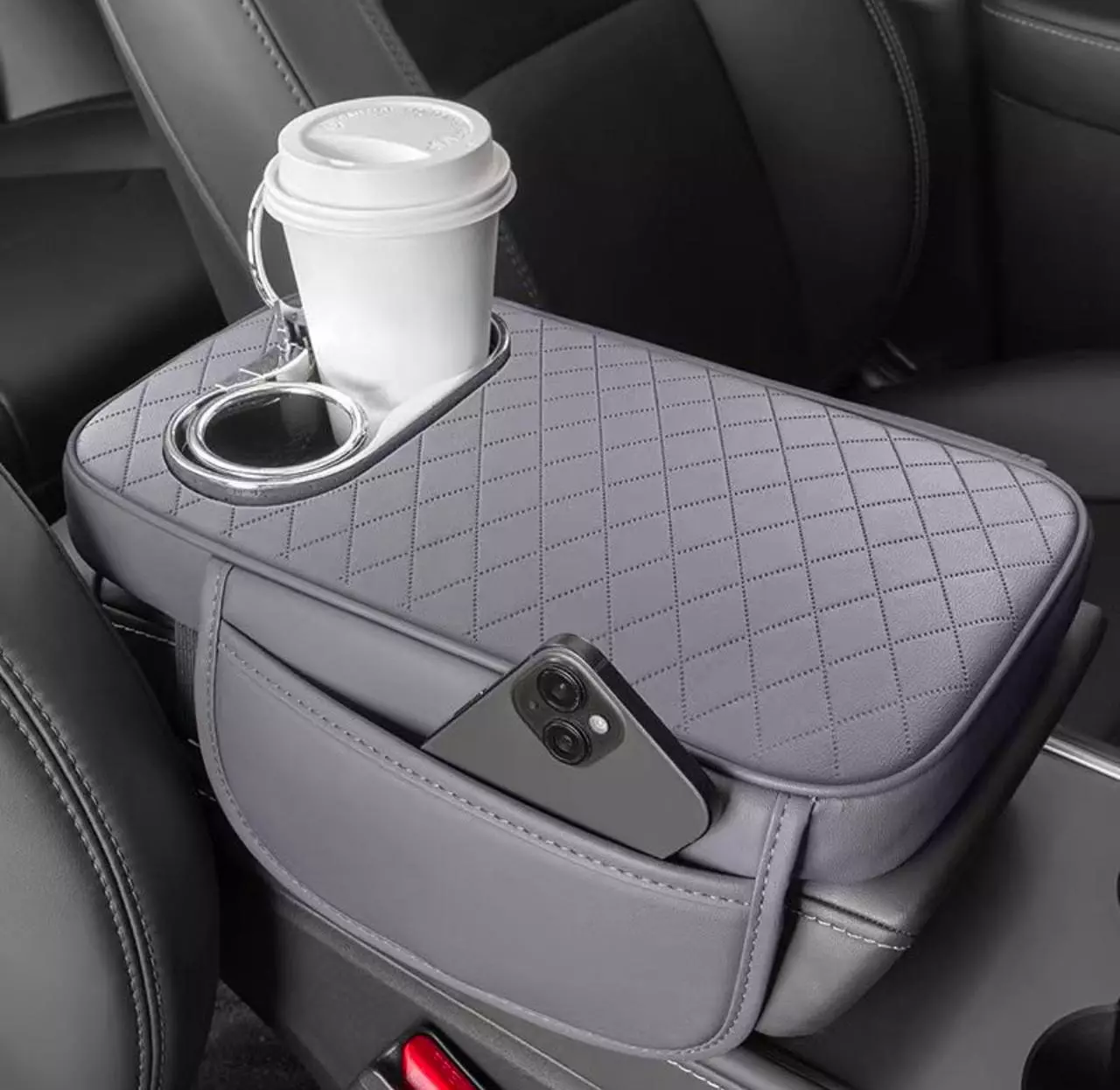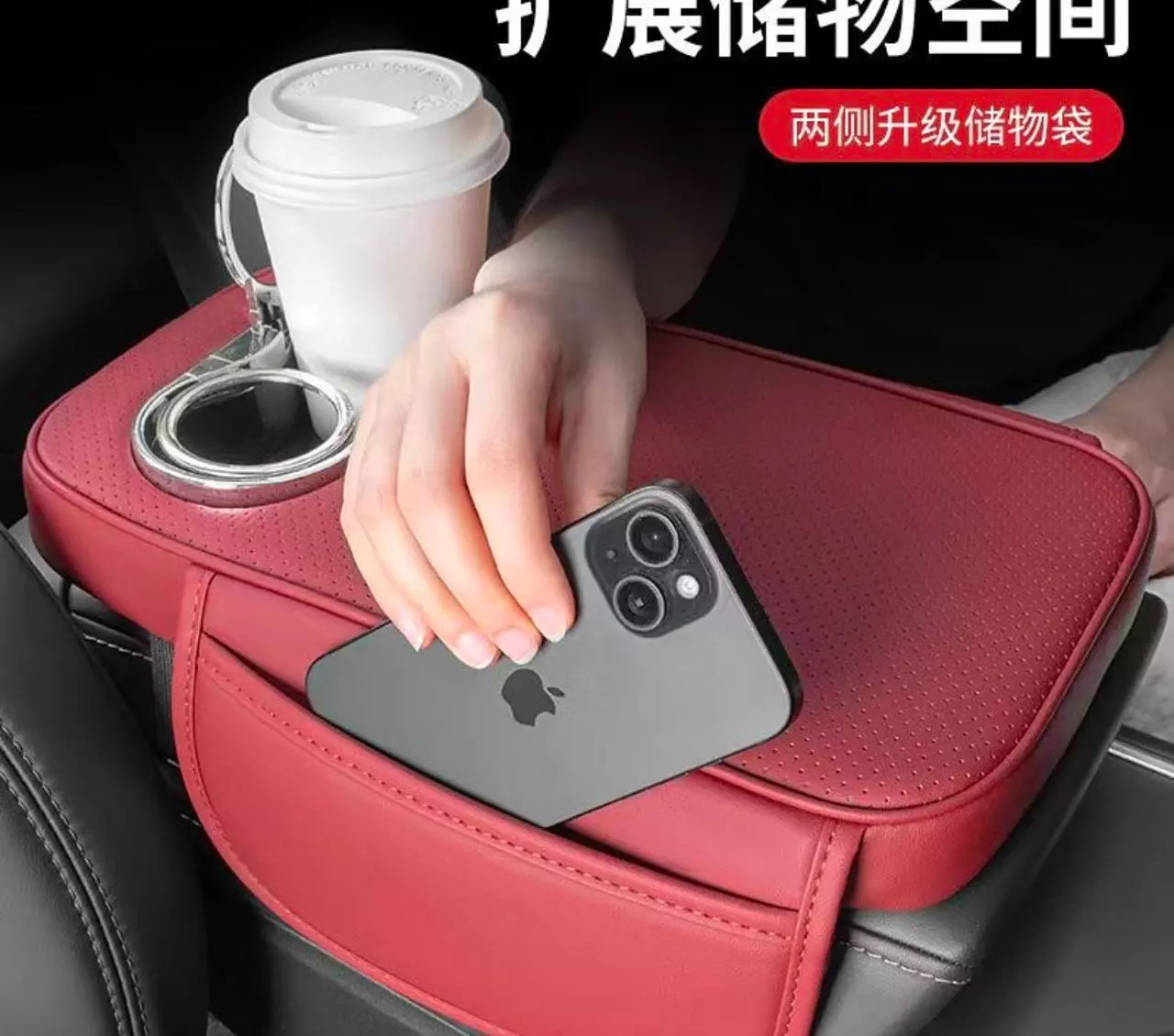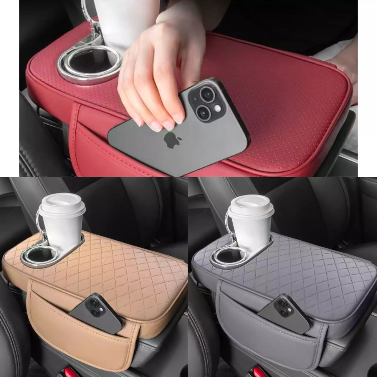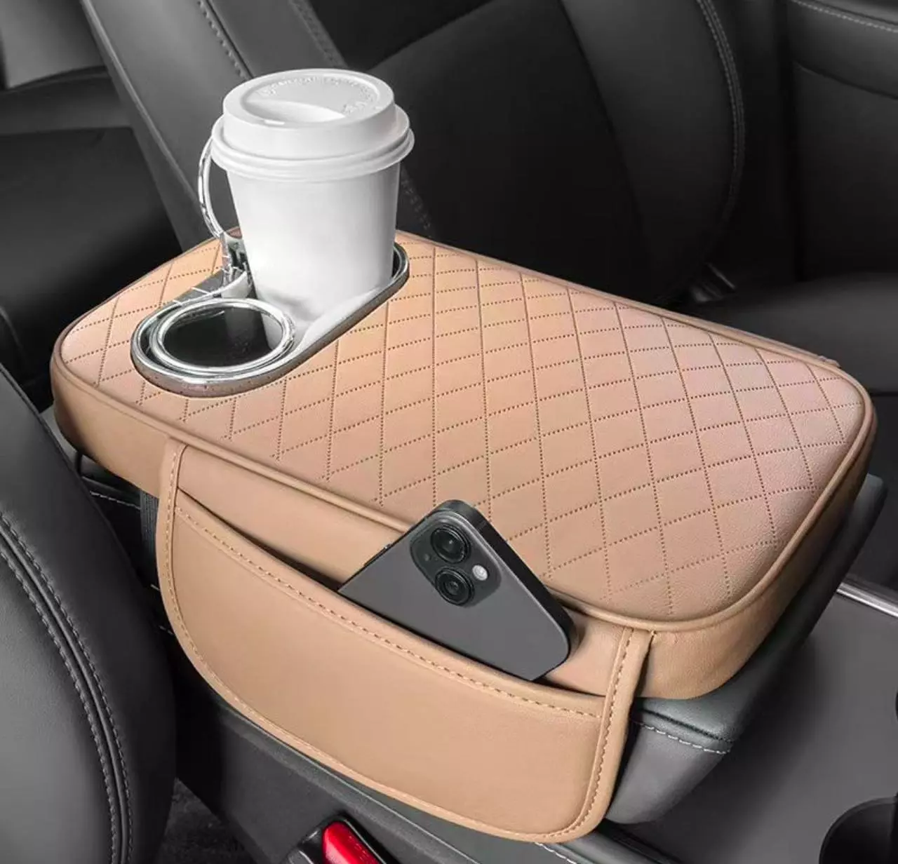 Leather Car Armrest With Dual Cup Hodler & Side Pockets