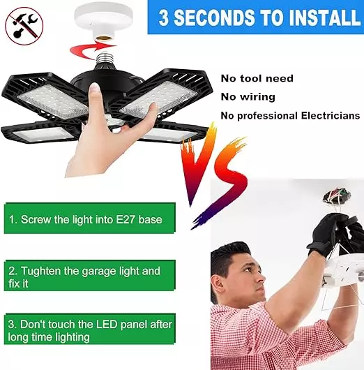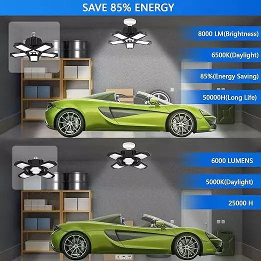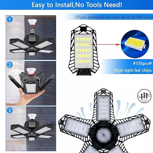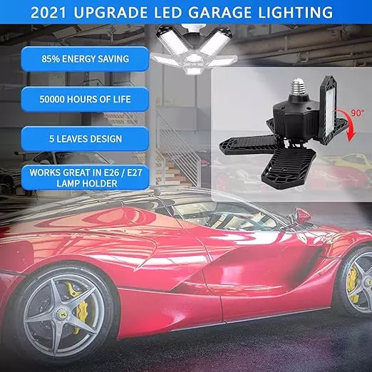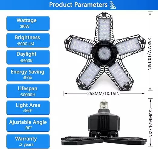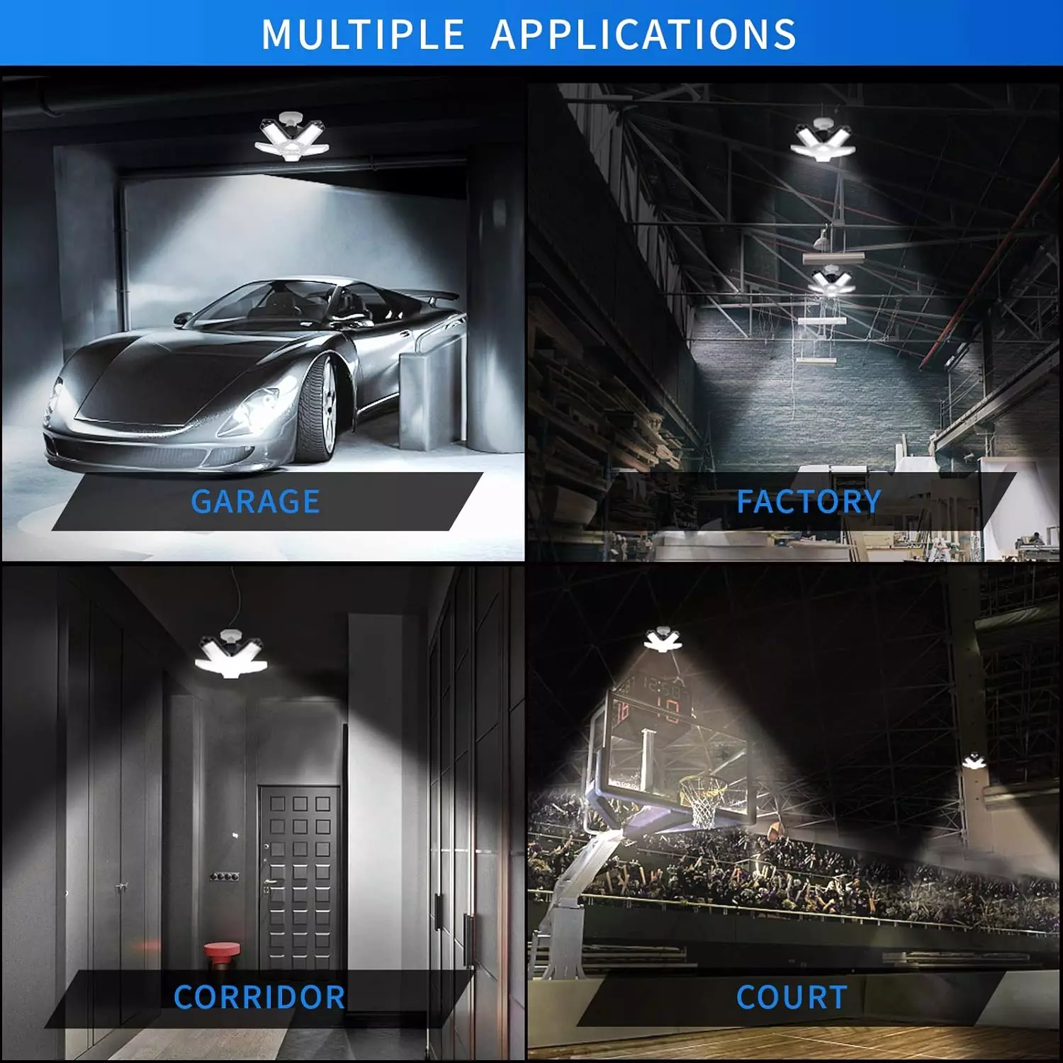 • Adjustable 5 Leaves Wings Panels : Super Bright Led Garage Light Unique wide-angle garage lighting design with Five 90 degree adjustable multi-position panels.