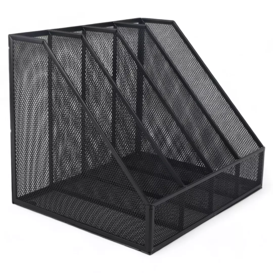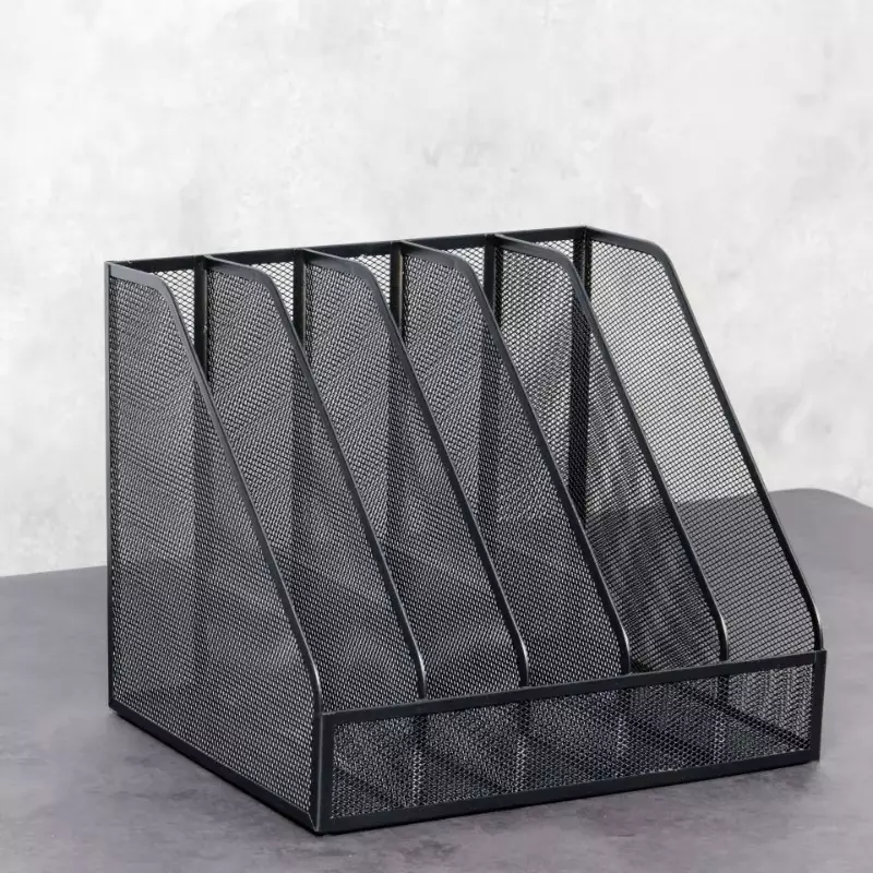 The Metal Mesh File Holder BLACK is a sleek and durable organizational tool designed to keep your workspace tidy. Key features include a sturdy metal mesh construction for long-lasting use, a black finish that complements any office decor, and multiple compartments to efficiently sort and store files, documents, and folders. Its open design allows for easy access and visibility of contents, while the non-slip rubber feet ensure stability on any surface. This file holder is ideal for enhancing productivity by reducing clutter and providing a professional, organized appearance to your workspace.