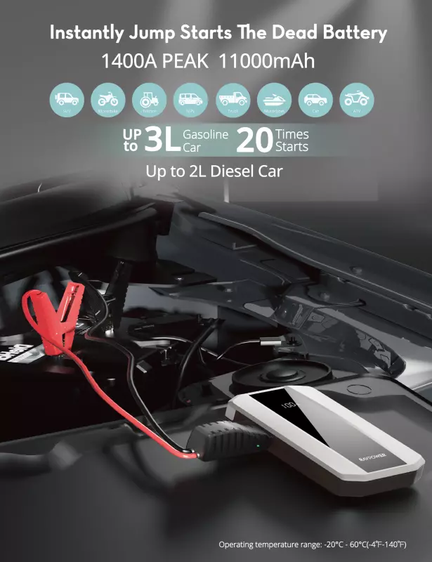 • Starting Current: 300A, with a peak current of up to 1400A, providing a strong boost to ensure easy and quick engine start.