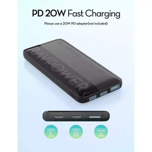 RAVPOWER PD 20W 3 Ports Power Bank (10000mAh) - Black