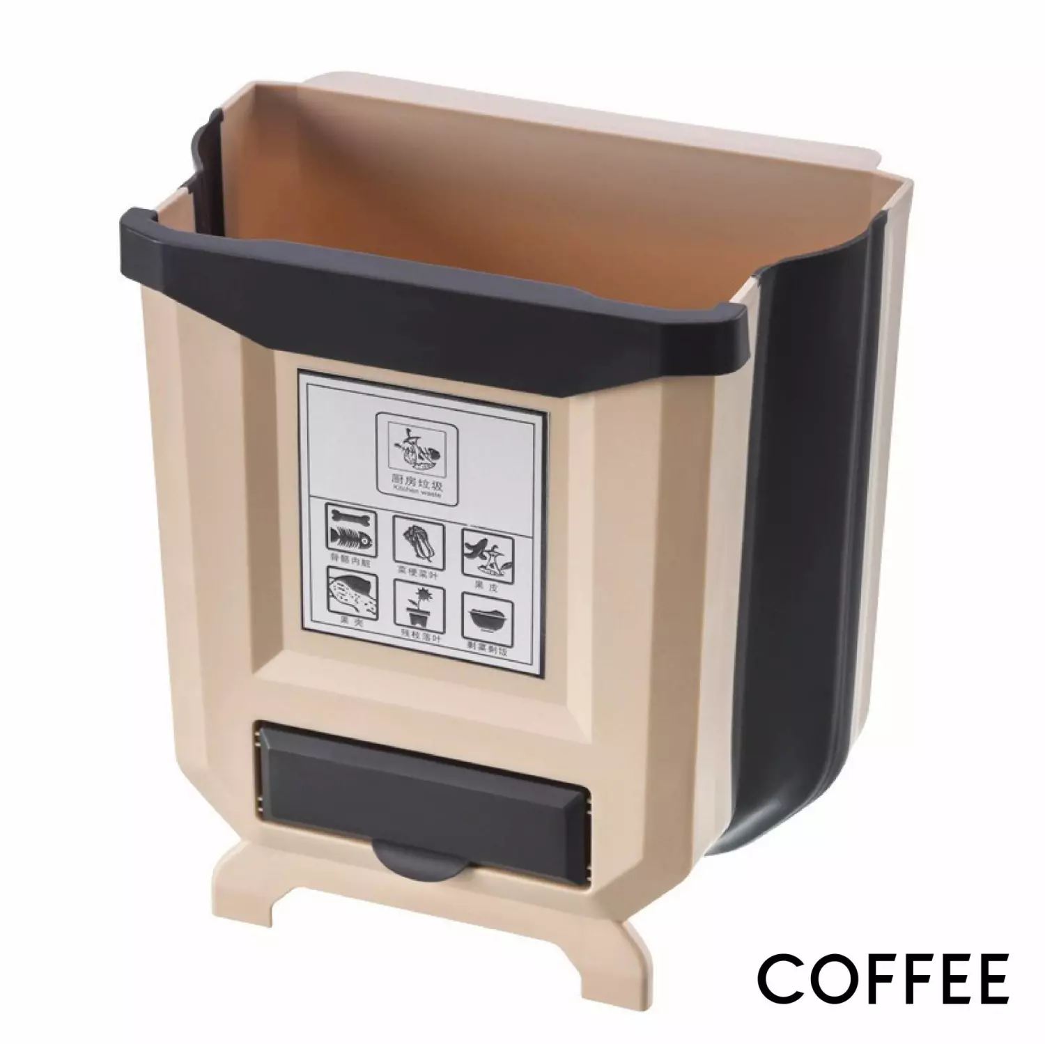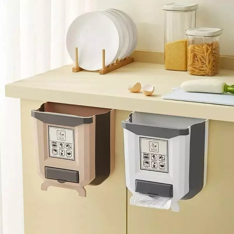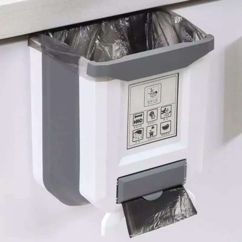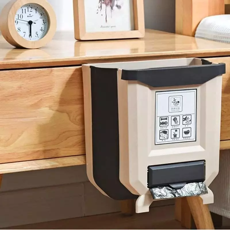 • Folding trash can makes it easy to be used in a kitchen. When you don't use it, you can fold it, and it saves the space in your kitchen.