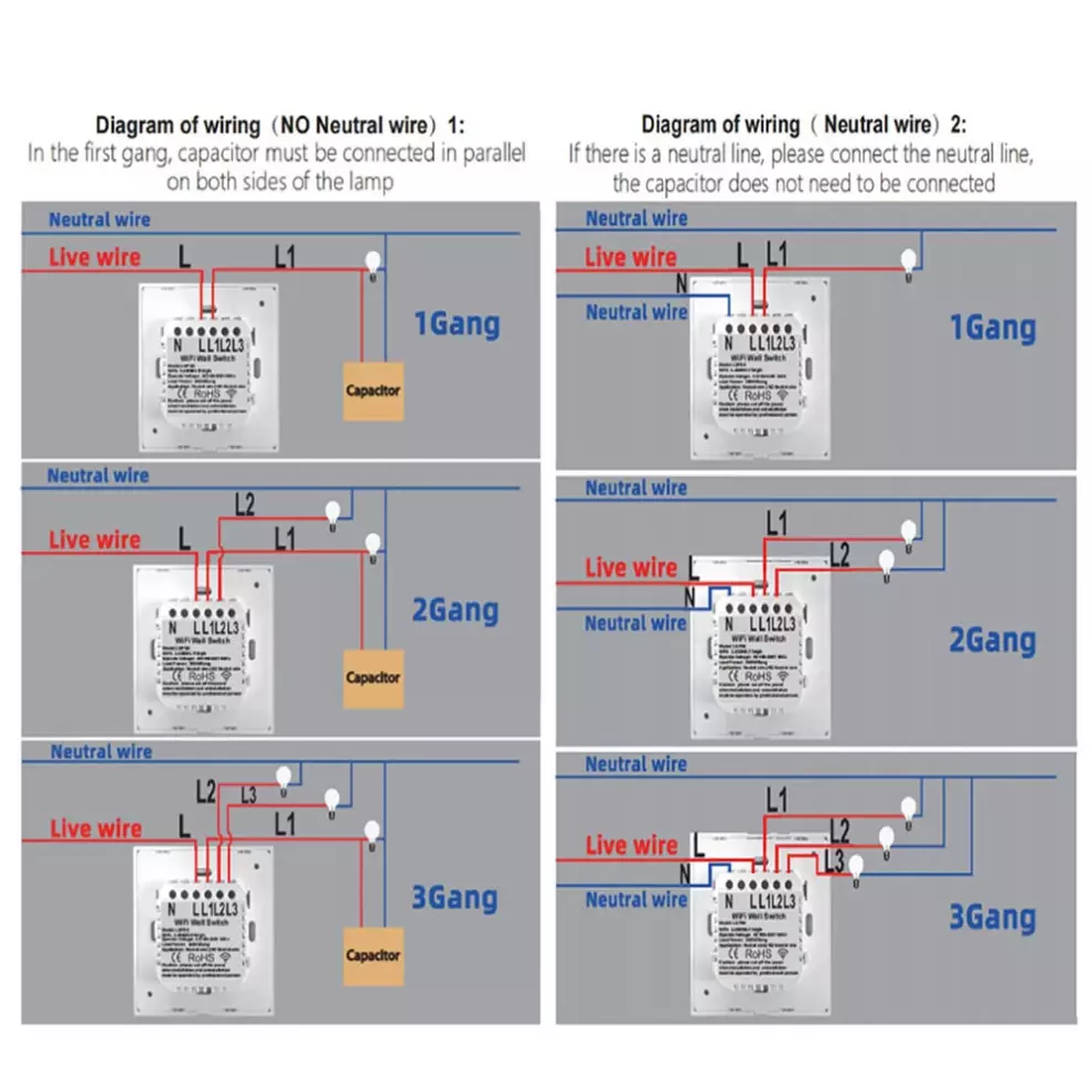 تتوافق مفاتيح الاضاءة مع تقنية الواي فاي WIFI 2.4GHZ للتحكم عن بعد لتتمكن من مراقبة اضاءة منزلك والتحكم بها من اي مكان بالعالم عن طريق تطبيق " SMART LIFE" او "TUYA" .