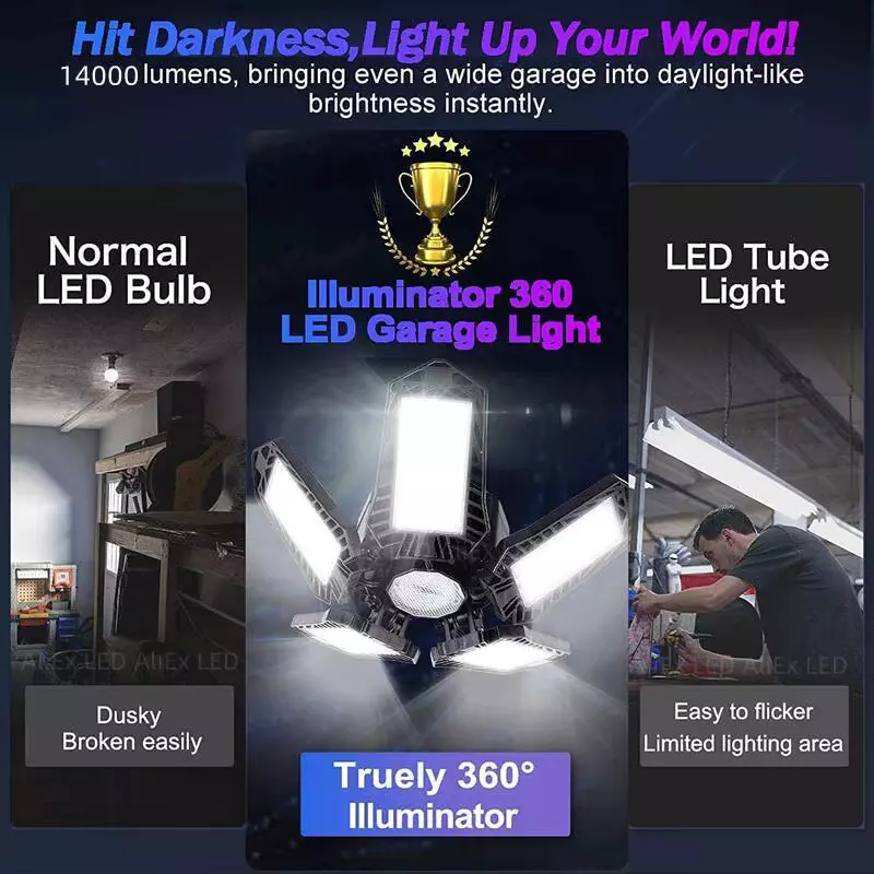 سهولة التركيب والاستخدام – لا حاجة إلى أدوات أو أسلاك، فقط قم بتركيب المصباح في قاعدة E26/E27 القياسية. يُعد بديلاً مثالياً لمصابيح الفلورسنت التقليدية في الجراجات، المستودعات، الطوابق السفلية، ورش العمل، ومعظم بيئات العمل.