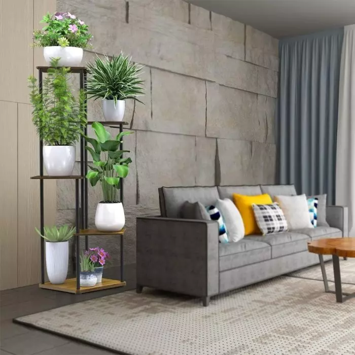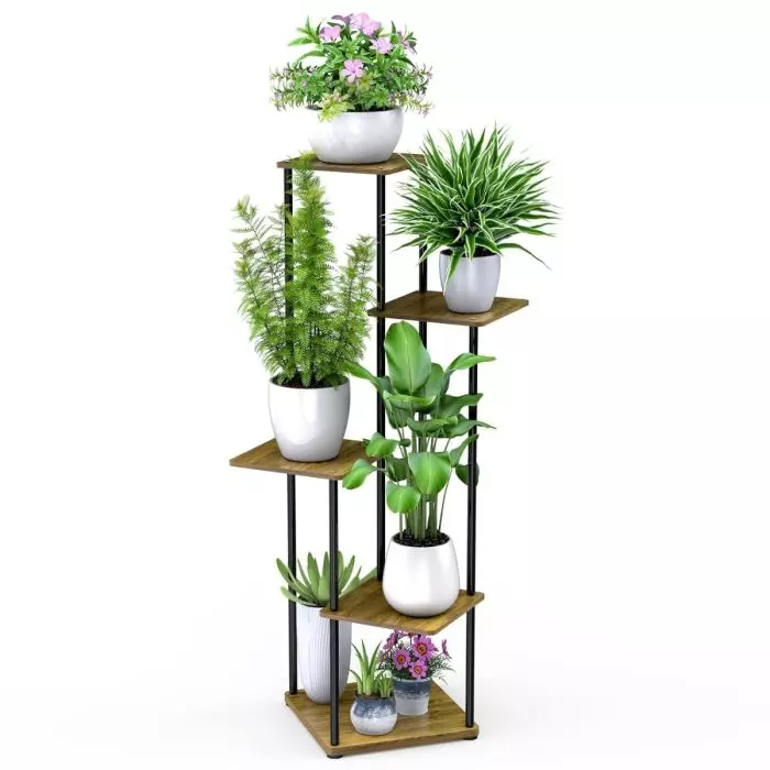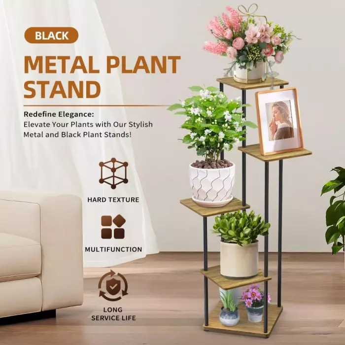 ستاند نباتات حديث مكون من 5 طبقات يوفر مساحة تخزين كافية للنباتات في أوعية يمكنك وضعها في زاوية غرفة المعيشة أو الشرفة أو خارج المنزل في أي مكان لتعزيز ديكور منزلك. مصنوع من المعدن ولوح MDF، غير قابل للتلف، أملس، ولون جميل، مع أرجل معدنية لتعزيز ثباته وتوازنه
