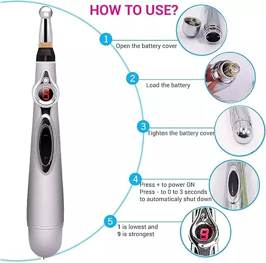 9 أوضاع للشدة: يمكنك التكيف مع المستوى المناسب من الطاقة بناءً على احتياجات العلاج المختلفة، عندما تشعر بنبض قوي عن طريق قلب قلم الوخز بالإبر حول جسمك، وهذا يعني أنك تجد نقاط الوخز بالإبر.