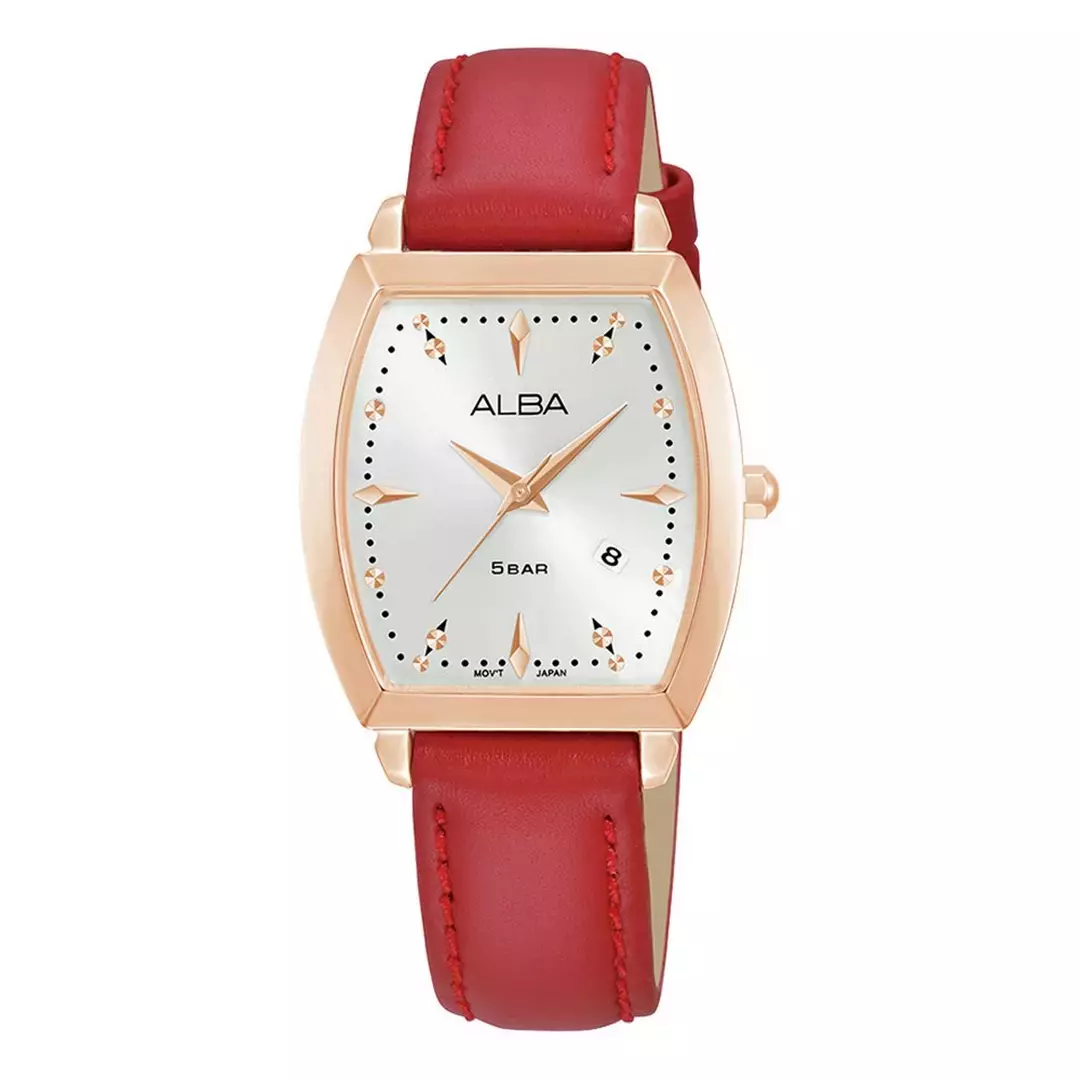 تعد ساعة ALBA النسائية مزيجاً مثالياً من الأناقة والدقة، بتصميم عصري وأنيق. مع هيكل فضي من الفولاذ المقاوم للصدأ وسوار جلد أحمر مميز، توفر لكِ هذه الساعة لمسة من الفخامة في كل لحظة. حركة كوارتز دقيقة ومقاومة للماء حتى 5 بار تجعلها الاختيار المثالي للمرأة العصرية.