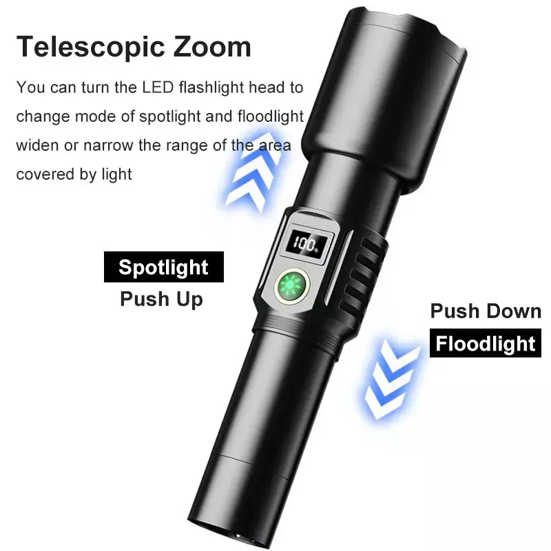 • مصباح يدوي تكتيكي من سبائك الألومنيوم مقاوم للماء بشاشة رقمية LCD 6000 لومن و20 وات
