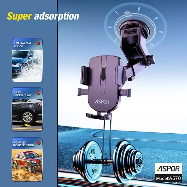 يتكون حامل ASPOR A570 من حامل وحامل Duomo، مع واقيين ماديين يضغطان على حواف المنتج، ويفصل بينهما ذراعان، مما يسمح لك بتمرير هاتفك بسهولة بينه وبين المؤقت.