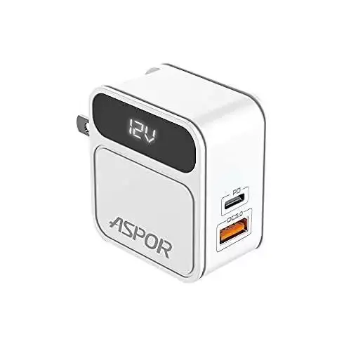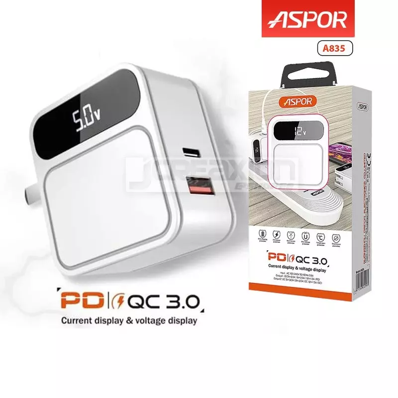 شاحن A835 بتقنية الشحن السريع وشاشة عرض ديجيتال مزود بتقنية بي دي وكيو سي PD الي لايتنيج من اسبور