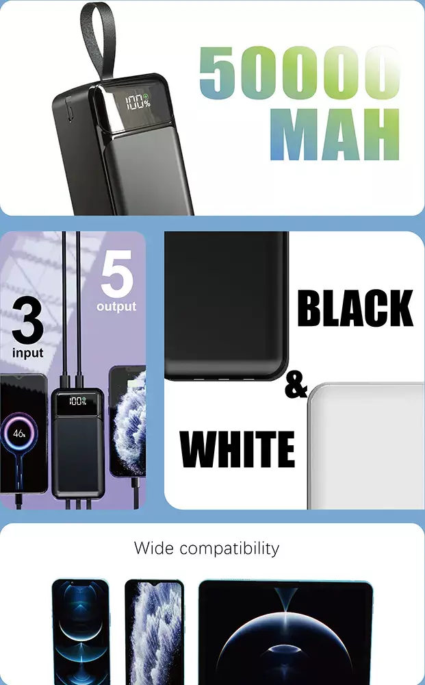 • باور بانك عالي الجودة وسريع السعة ومصمم خصيصًا لك. بسعة 50000 مللي امبير لتتمكن من استكمال أنشطتك اليومية.