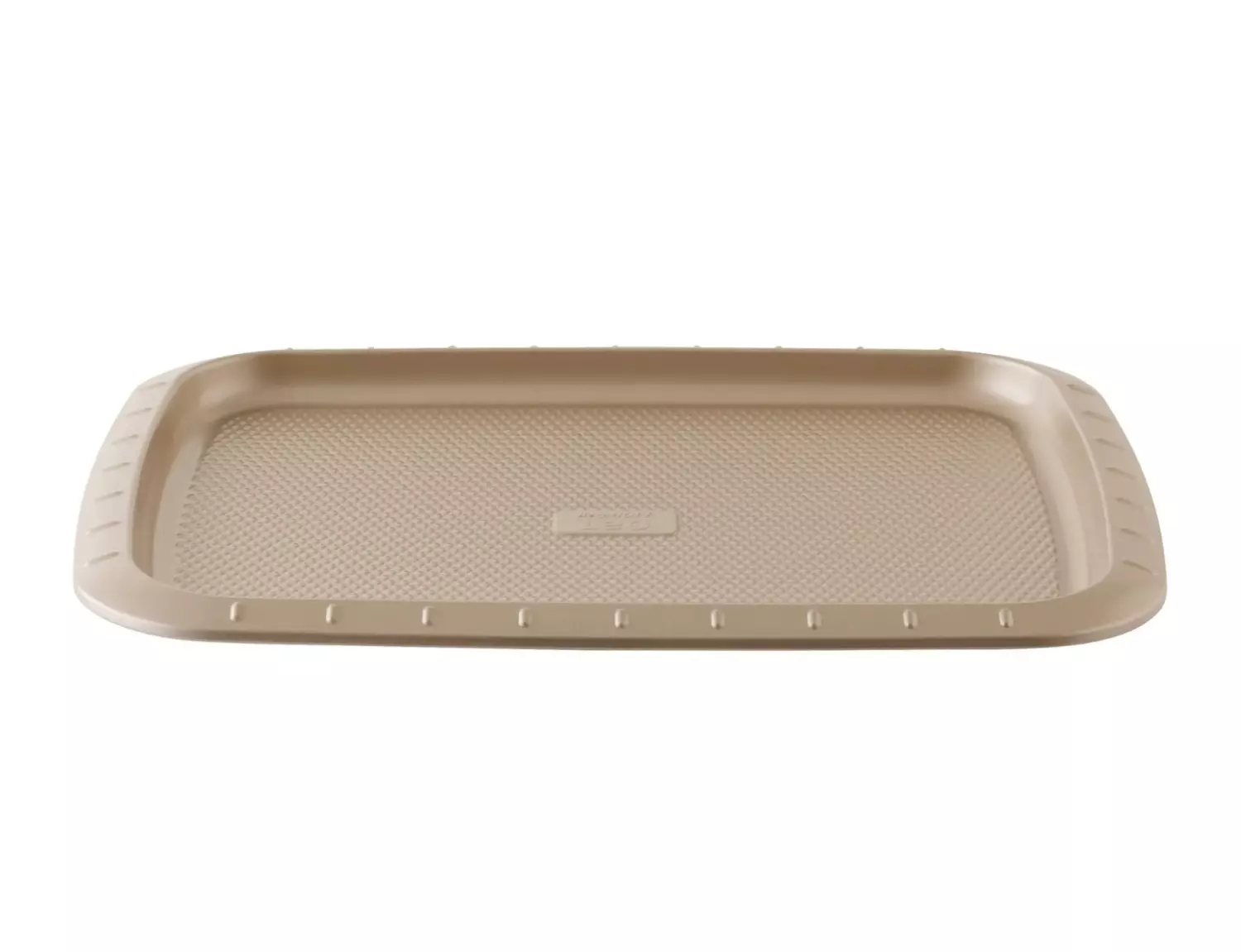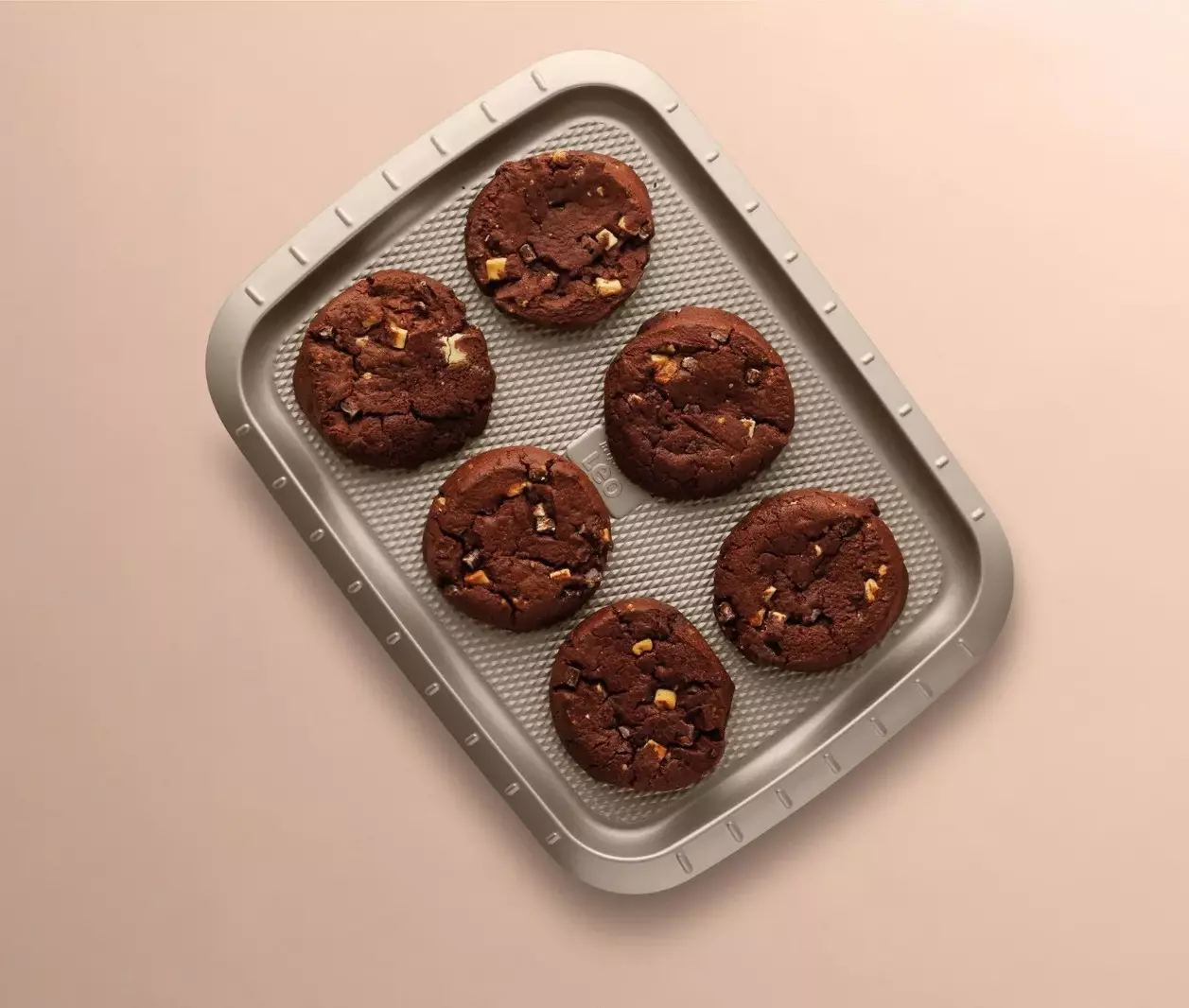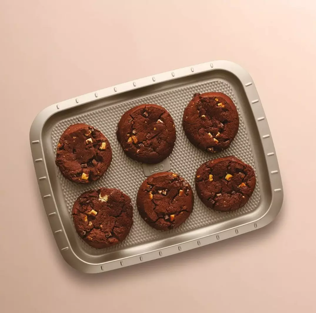Cookies, pastries or other delicious treats, you’ll easily bake them to perfection on this non-stick cookie sheet. The carbon steel material with a diamond-textured surface guarantees even baking while the non-stick coating makes sure you can easily get your baked goods off once you’ve taken them out of the oven. This means no baked-on mess on the sheet and, more importantly, an easy clean-up!