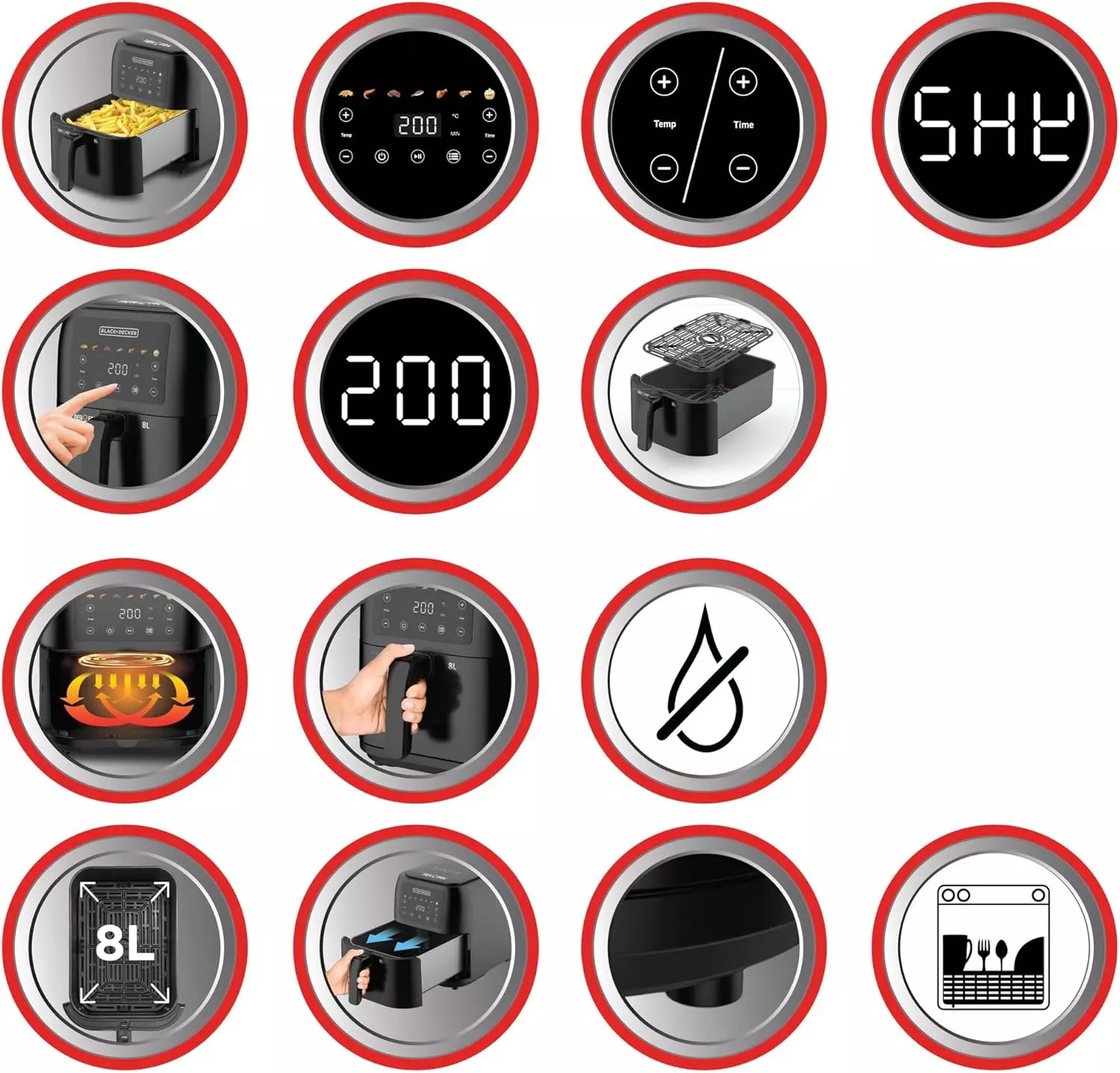 مقلاة هوائية بلاك اند ديكر 1700 واط - سعة 8 لتر، تحكم رقمي باللمس