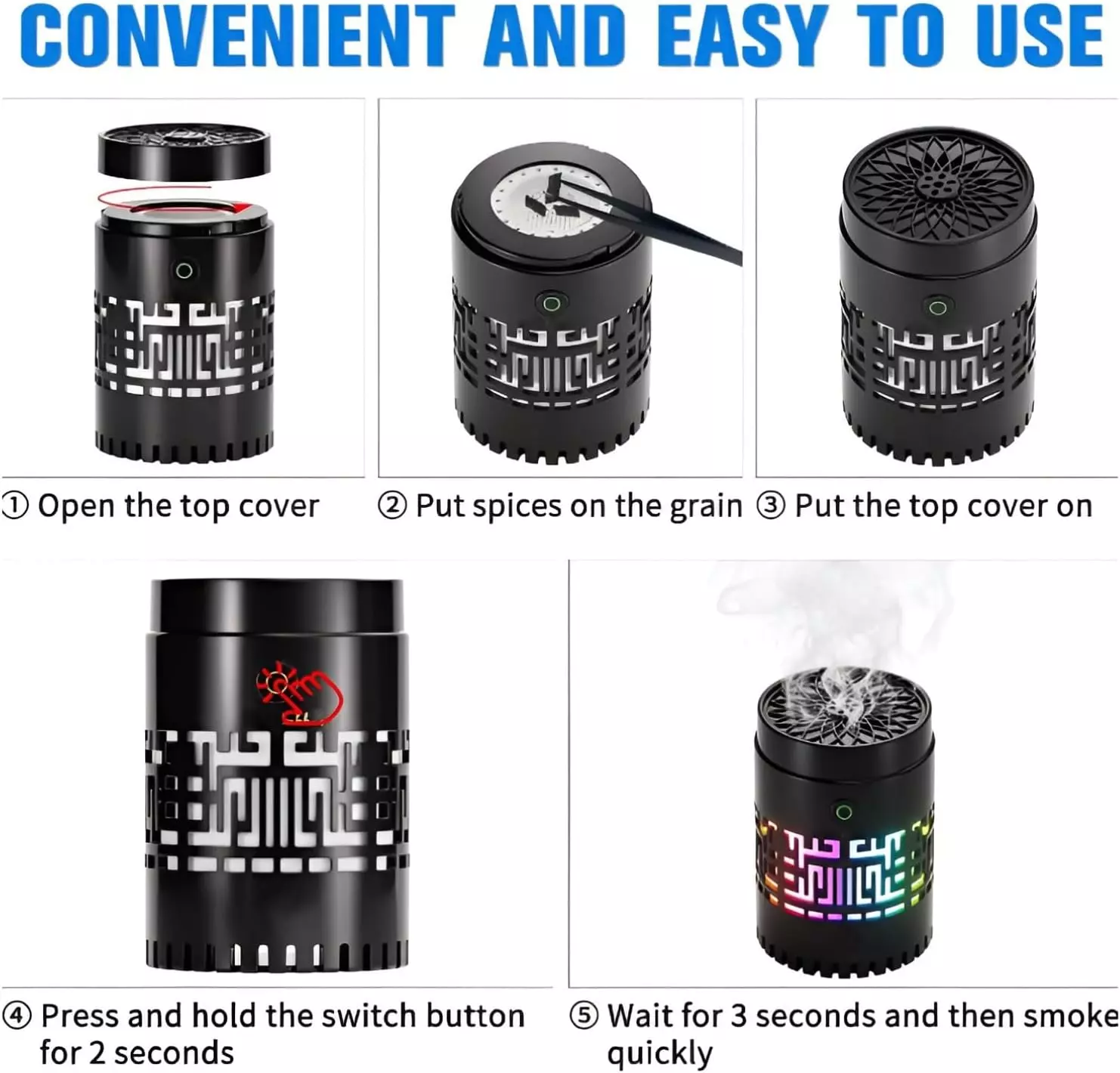 تصميم متعدد الوظائف: يجمع بين مبخرة البخور ومكبر صوت القرآن الكريم للاستخدام متعدد الاستخدامات. مثالية للاستخدام في السيارات أو المنازل أو أي مكان محمول.