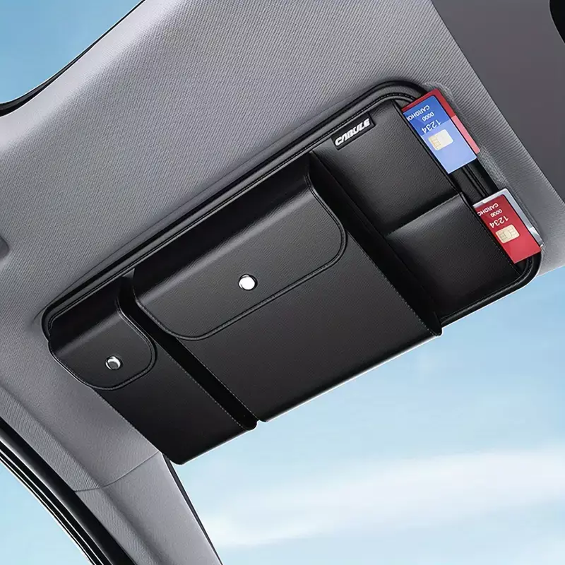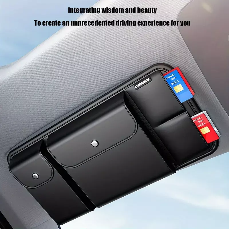 يتميز هذا المنظم المتعدد الجيوب والأقسام بتخزين نظاراتك ورخصة القيادة والتذاكر والبطاقات. مصمم ليتناسب بشكل آمن مع واقي الشمس في سيارتك، يضمن سهولة الوصول إلى الضروريات أثناء القيادة.