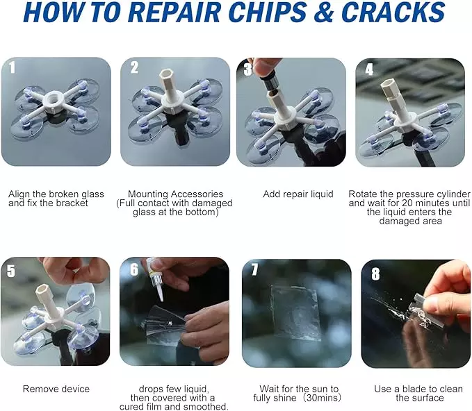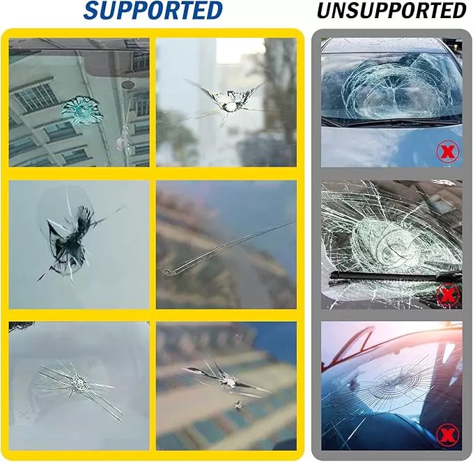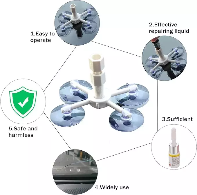 مجموعة إصلاح الزجاج الأمامي: تحتوي مجموعة إصلاح الزجاج الأمامي المطورة على سائل إصلاح خاص بقوة قص تصل إلى 20P-A. حتى إذا تم كسر الزجاج، فإن الجزء الذي تم إصلاحه لن ينكسر. بعد اكتمال الإصلاح، لن تنبعث أي رائحة ضارة.
