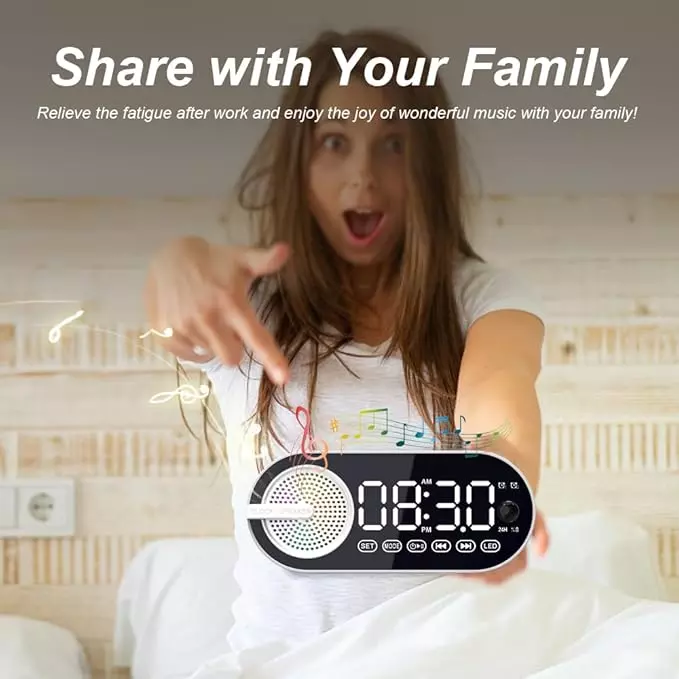 ميزة المنبه المزدوج: مع ميزة المنبه المزدوج، يمكنك ضبط وقتين مختلفين للاستيقاظ، مما يجعله مثاليًا للأزواج أو أي شخص لديه جداول زمنية متعددة. استيقظ على محطة راديو FM المفضلة لديك أو اختر من بين مجموعة واسعة من الألحان والنغمات الهادئة المتوفرة على مكبر صوت Bluetooth.