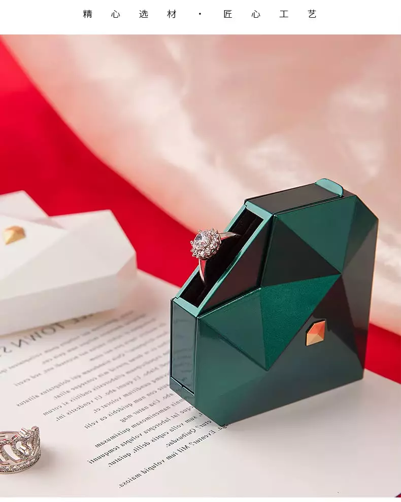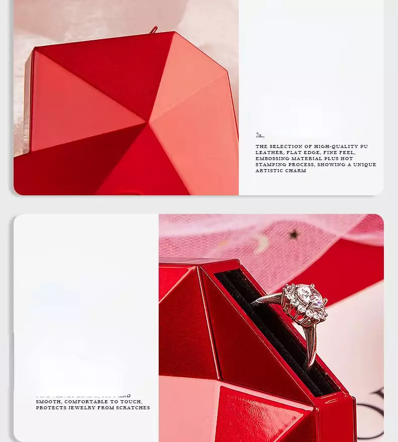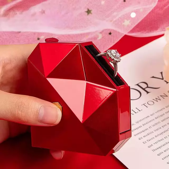 • آلية فتح أوتوماتيكية: تفتح تلقائيًا عند الضغط على الزر الذهبي، مما يضيف تأثيرًا مميزًا عند تقديم الخاتم.