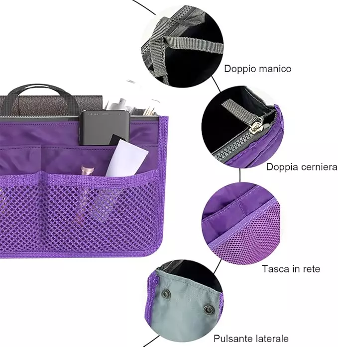 الاستخدام اليومي - يمكن لمنظم المحفظة للحقائب أن يحمل الأشياء التي تحتاجها يوميًا، مثل مستلزمات التجميل والمفاتيح والهاتف المحمول والبطاقات والدفاتر وأغراض السفر وما إلى ذلك.