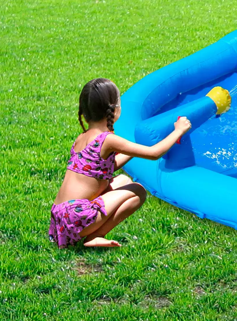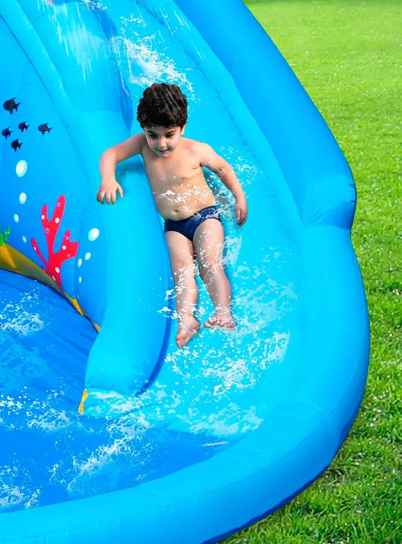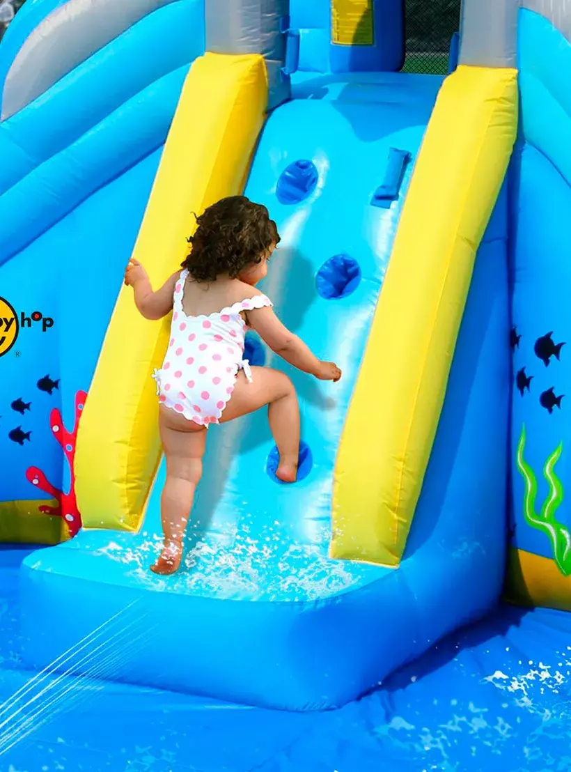 يعد Shark Pool هذا مغامرة وتجربة رائعة في أيام الصيف الحارة. مجهزة بالعديد من الميزات الجديدة مثل مدفع المياه والزلاجة المائية وميزة تسلق الصخور. يعد مسبح القرش هذا ممتعًا للغاية وسيخلق الكثير من الذكريات التي لا تنسى لأطفالك وأصدقائهم. إنه سهل وسريع جدًا للنفخ ويمكن تعبئته بسهولة مرة أخرى للتخزين.