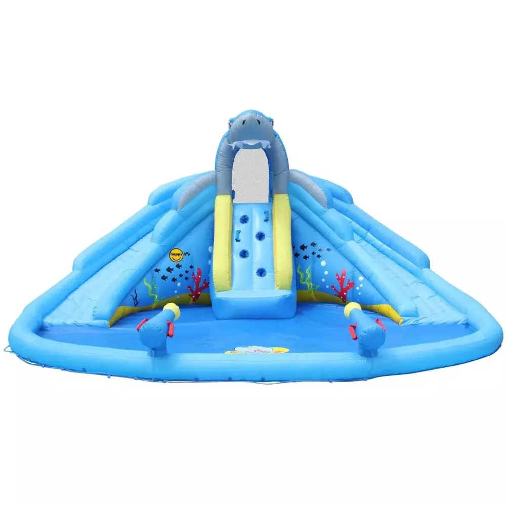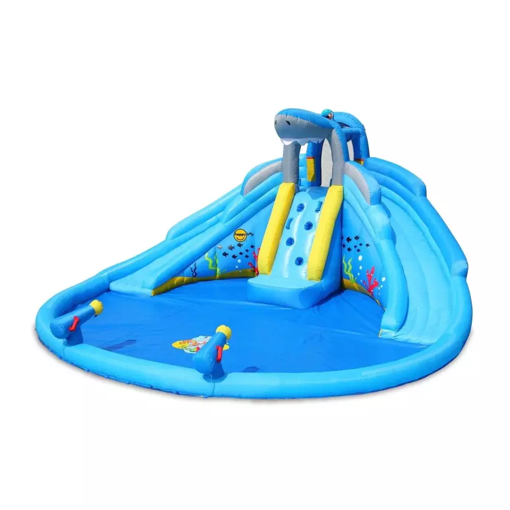 لا شيء يقول المرح مثل Shark Pool! سيحب الأطفال الانزلاق إلى أسفل الشريحة المائية القابلة للنفخ وإلى حوض سباحة مستنقع أسماك القرش! يوجد أيضًا حوض سباحة مدمج ورشاشات على طول ذيله وجدار للتسلق. توجد أيضًا شبكة حول المنصة للسلامة ويمكن للآباء رؤية الأطفال من خلال الشبكة. يمكن للأطفال الاستمتاع بمسبح أسماك القرش الخاص بهم طوال العام.