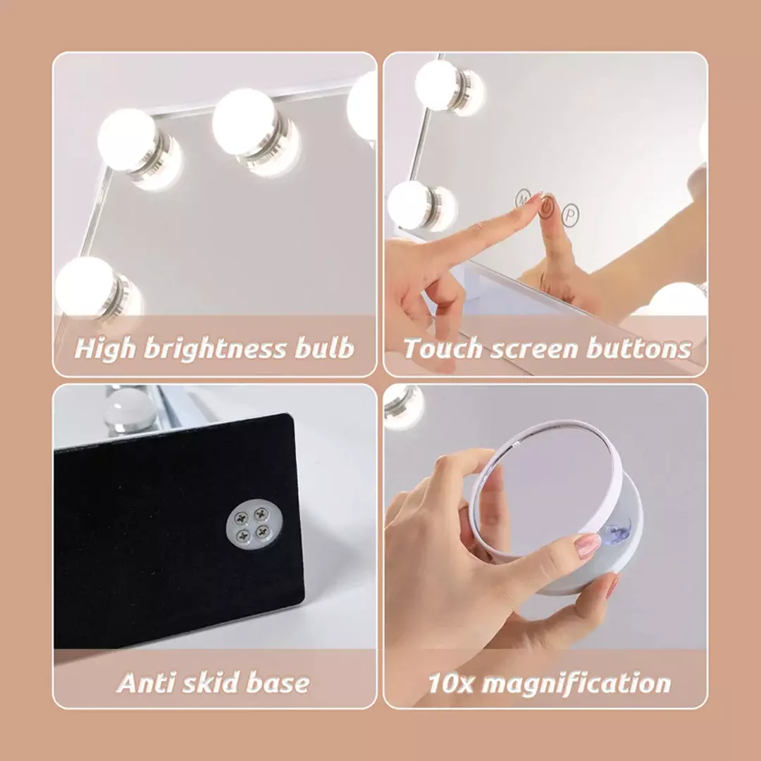 زاوية قابلة للتعديل وأضواء LED قابلة للتعتيم: تتيح لك الدوران 360 درجة الحصول على زاوية مثالية عند وضع المكياج. توفر لك مصابيح LED القابلة للتعديل أفضل إضاءة، مما يسمح لك برؤية وجهك بوضوح!