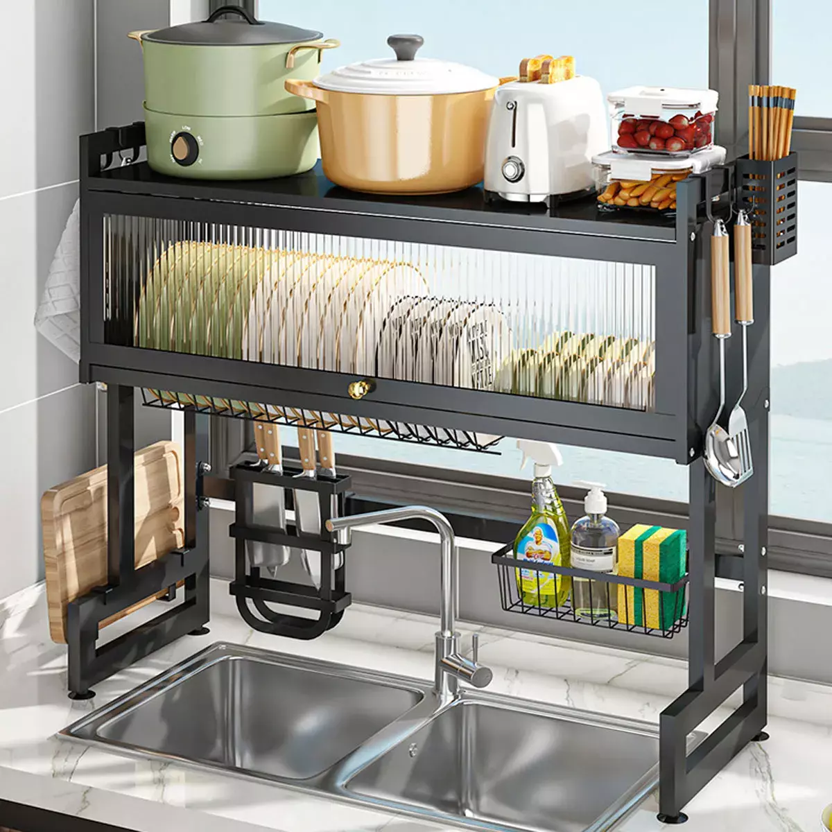 رف تجفيف وخزانة أواني المطبخ متعدد الاستخدامات