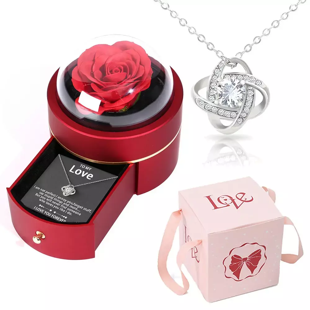 يتميز هذا الطقم الفاخر بصندوق مجوهرات أنيق على شكل وردة مع درج سحري مخفي مثالي لتقديم عقد أو خاتم. تحتوي العلبة على وردة حمراء محفوظة داخل قبة شفافة، مما يرمز إلى الحب الأبدي، مما يجعلها هدية مثالية لعيد الحب، الذكرى السنوية، الخطوبة، والمناسبات الخاصة
