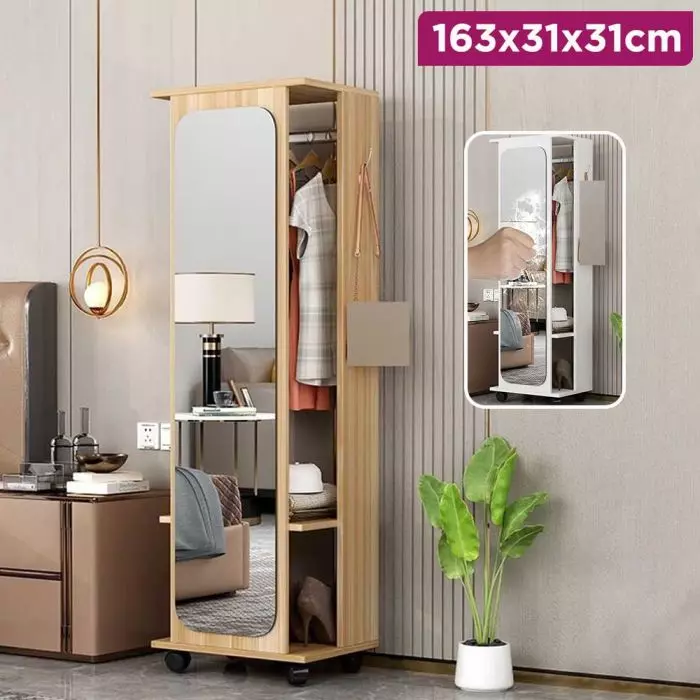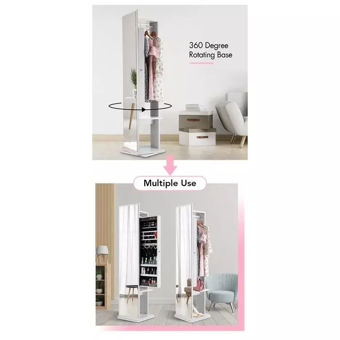 مرآة كاملة الجسم مع مرآة بطول كامل، تدور 360 درجة، أرفف تخزين خلفية، خزانة مرآة قائمة، سعة تخزين كبيرة