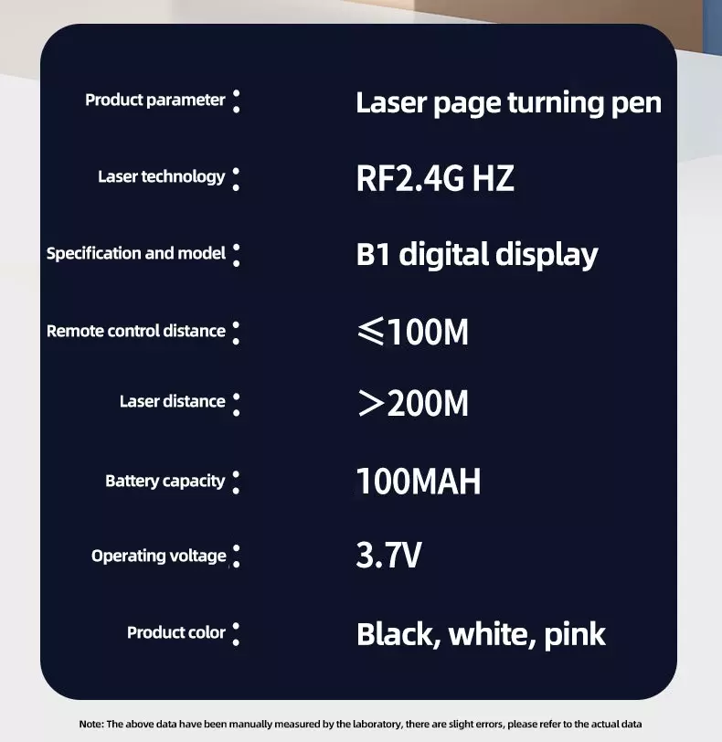 توافق متعدد الأنظمة، مستندات متعددة التنسيقات، يدعم أنظمة التشغيل Windows 7 وما فوق، Mac OS، Android وأنظمة التشغيل الأخرى. يدعم تقليب صفحات الجدول بتنسيقات مكتبية متعددة. مسافة التحكم عن بعد 100 متر + مسافة الليزر 200 متر + سعة البطارية 100 مللي أمبير. يضمن نقل المعلومات المنفصل بزاوية 360 درجة استقبالًا دقيقًا للصفحة بغض النظر عن الزاوية. النوع C- شحن (شحن لمدة ساعة واحدة يمكن استخدامه لمدة 60 يومًا) مع حقيبة أمان.
