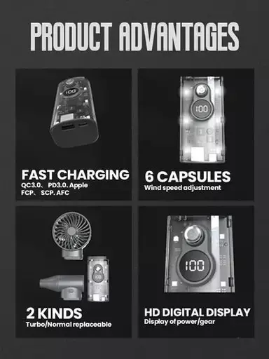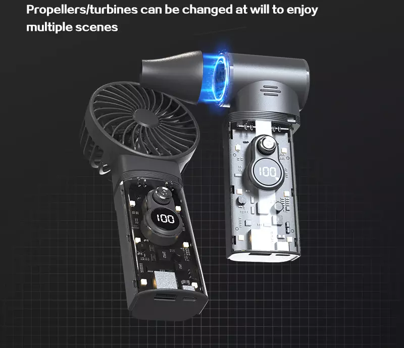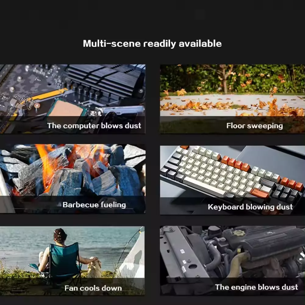 تُعد مروحتنا التوربينية متعددة الوظائف مصدرًا قويًا للتنوع، وهي مصممة لتلبية مجموعة واسعة من الاحتياجات. توفر هذه المروحة عالية السرعة تبريدًا استثنائيًا مع 30 سرعة قابلة للتعديل وتتفوق في إزالة الغبار والتنظيف ونفخ الحطام. تتميز ببنك طاقة مدمج، مما يسمح لك بشحن أجهزتك أثناء التنقل. مع وجود ملحقين مختلفين قابلين للتبديل، يمكنك تخصيص وظائف المروحة لمهام مختلفة. مثالية للاستخدام الداخلي والخارجي، يمكنها المساعدة بكفاءة في الشواء الخاص بك من خلال تعزيز تدفق الهواء للحفاظ على قوة اللهب.